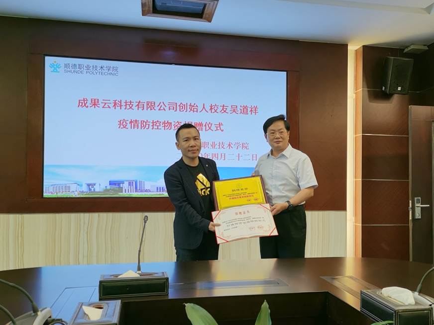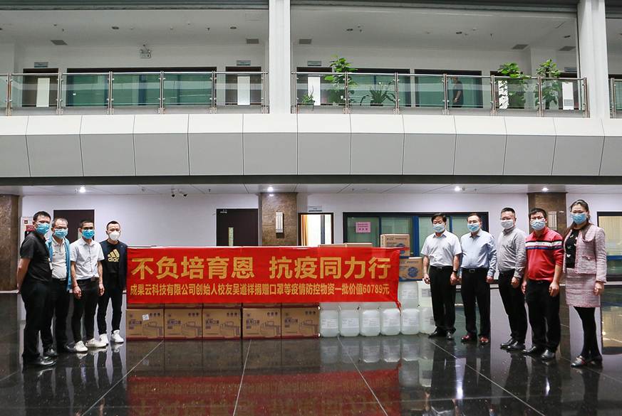 2020年4月22日,成果云科技有限公司创始人、校友吴道祥疫情防控物资捐赠仪式在学校行政楼举行。成果云(广东)科技有限公司创始人、德赢校友吴道祥,创业团队核心成员、校友张庆全、黄颖,学校校长夏伟、校友会基金会负责人、校党政办、党委宣传部、信息中心、顺大公司、后勤保卫处、资产设备处等相关人员参加活动。