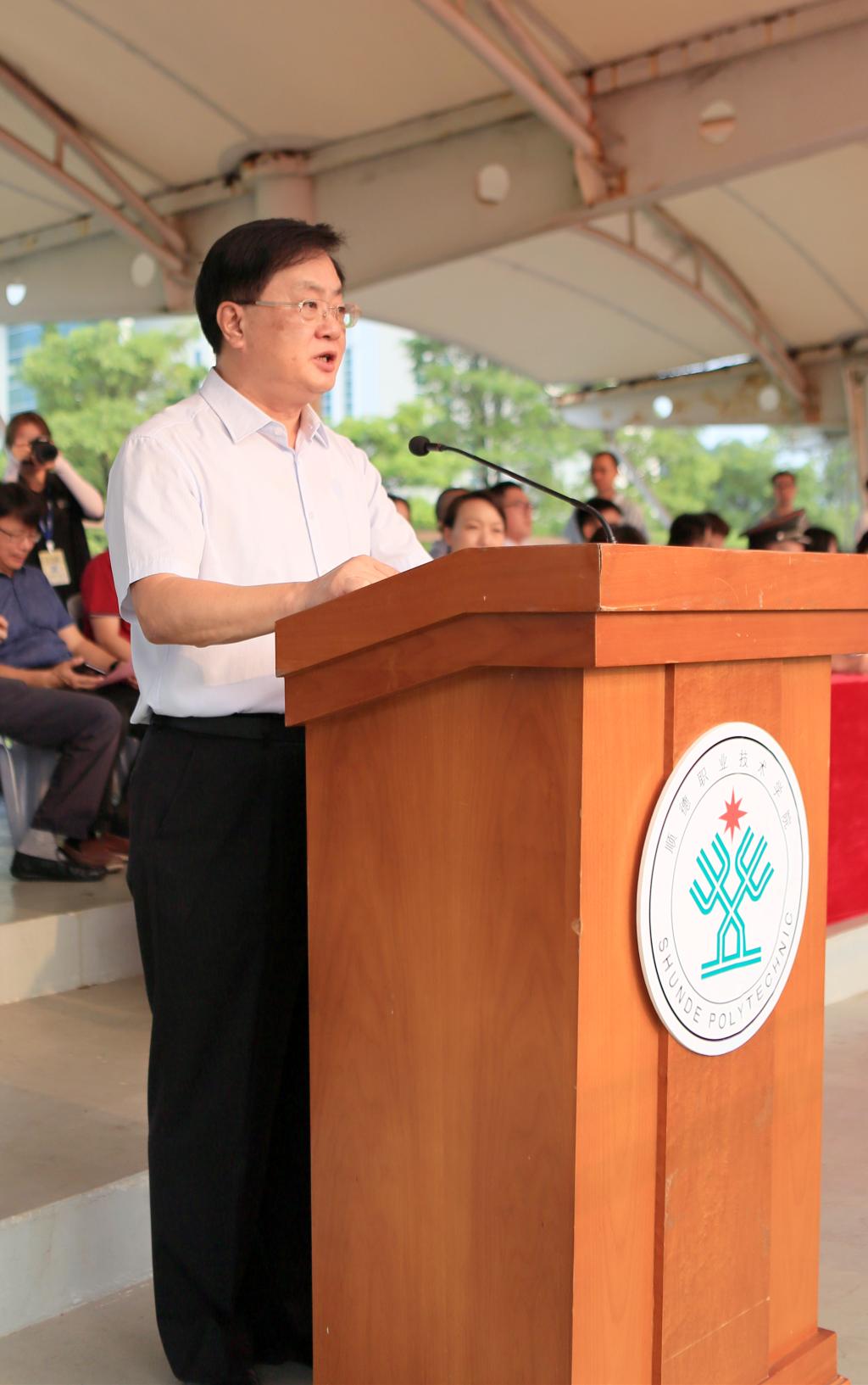 在升国旗、奏唱国歌后,学校校长夏伟作了题为《立成功志、强刚健骨、练真本领,做有志气、有骨气、有底气的新时代大学生》的讲话。他说,顺德职业技术学院是中国特色高水平高职学校和专业建设计划建设单位,建校20余年来,学校取得令人瞩目的发展成就,获得多项荣誉,为区域经济社会发展培养了一大批高素质技术技能人才。同学们选择顺职是正确的,学校和老师也定会不负大家的选择。