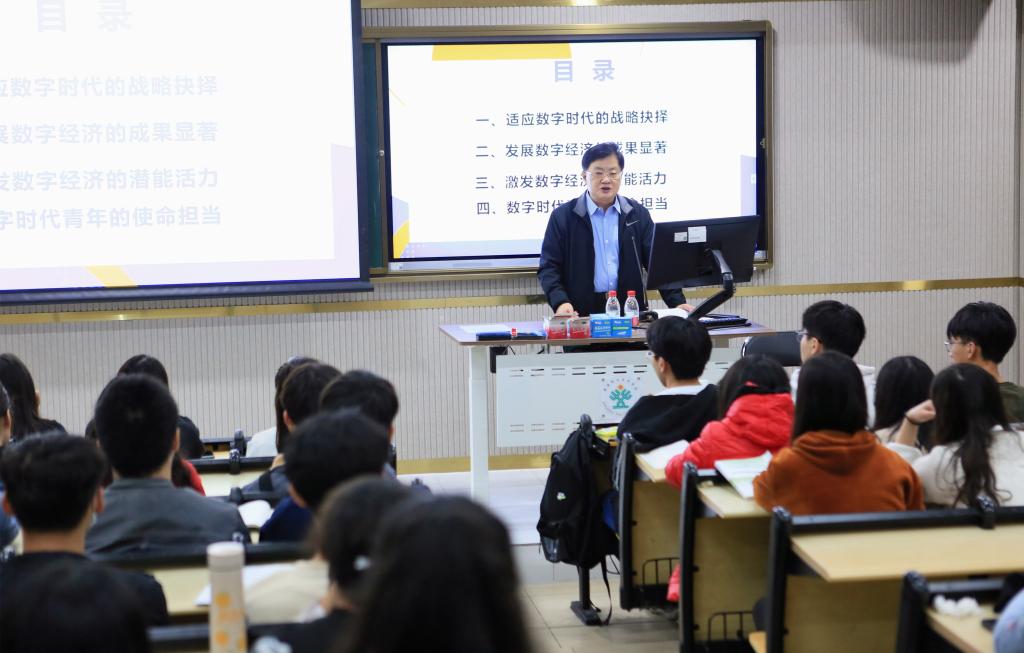 3月25日上午,夏伟以“数字赋能 青年有为”为主题,为2021级家具设计与制造1班、应用日语2班、应用英语3班的同学们上“思政第一课”。他带领同学们学习习近平总书记关于数字经济的重要论述,从“适应数字时代的战略抉择”“发展数字经济的成果显著”“激发数字经济的潜能活力”“数字时代青年的使命担当”四个方面展开授课。