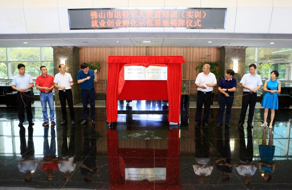 在热烈的掌声中,领导嘉宾共同为佛山市退役军人教育培训(实训)示范基地、佛山市退役军人创业孵化示范基地揭牌。