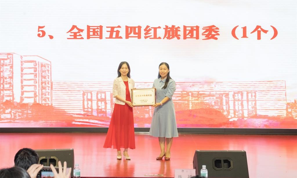 在2021-2022学年度共青团工作嘉奖环节,陈颖为德赢送上“全国五四红旗团委”奖牌,领导嘉宾分别为获得第二十一届大学生文化艺术节先进个人和优秀组织奖,学校五四红旗团委和优秀学生会,佛山市五四红旗团委标兵、优秀团干、优秀团员的组织和个人颁奖。