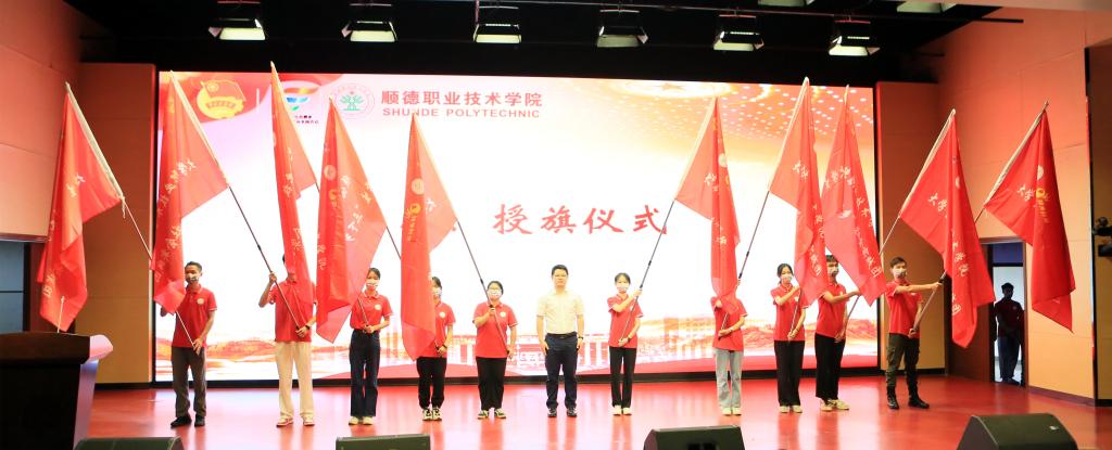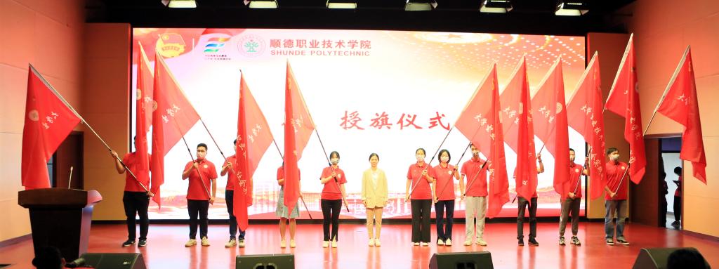 陈颖为德赢参与2022年大学生志愿者暑期“三下乡”社会实践活动的团队授旗。