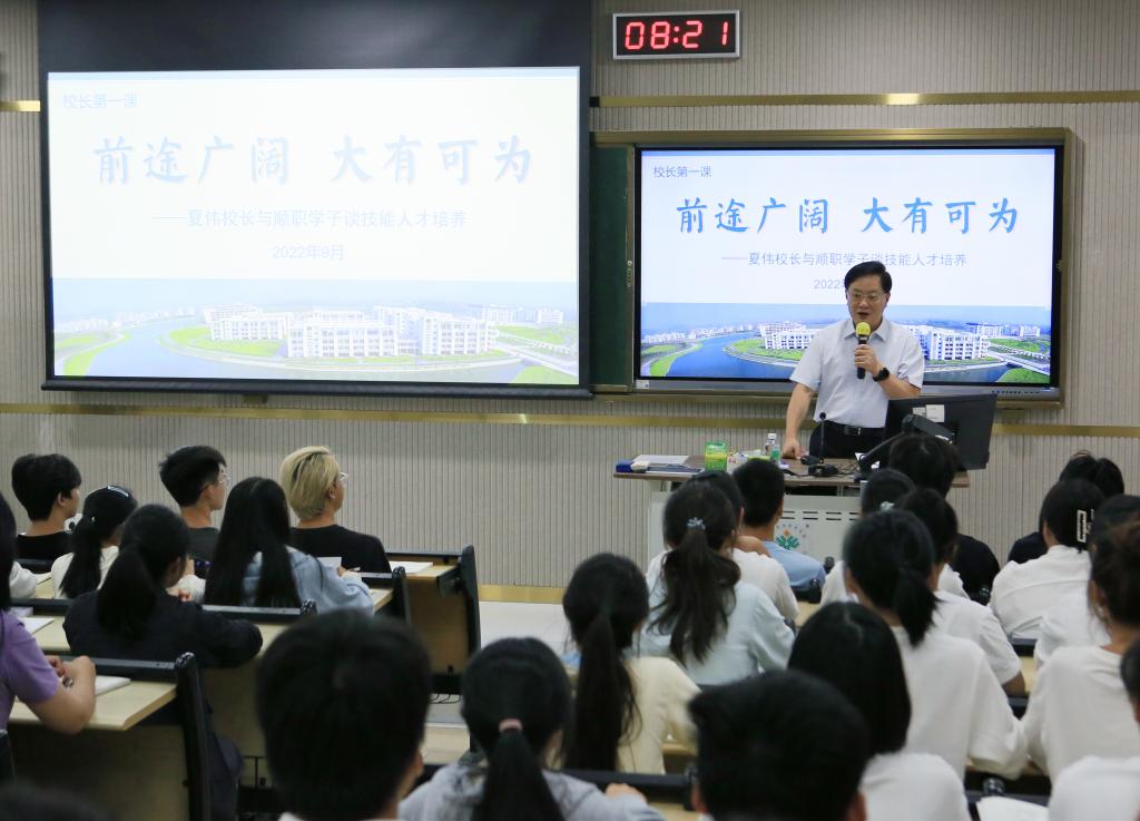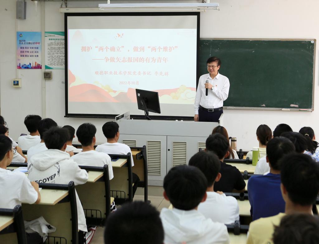 10月13日,夏伟在教学楼10栋206教室为2022级物联网应用技术3班、2022级环境监测技术2班、2022级药膳与食疗2班的学生上“思政第一课”。他以《前途广阔,大有可为——与顺职学子谈技能人才培养》为主题,勉励同学们学好知识和本领,以实际行动践行“请党放心,强国有我”的青春誓言。