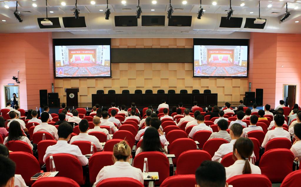 学校党政领导班子成员、全体中层干部、学生代表在学术交流中心一号报告厅集中收看