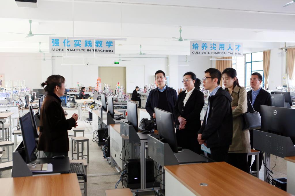 3月1日上午,国家职业教育虚拟仿真示范实训基地责任专家田秀萍带领教育部高等学校科学研究发展中心调研组一行来校调研虚拟仿真实训基地建设工作。学校党委委员、副校长杨小东,教务处、资产与设备管理处、智能制造学院负责人,有关二级学院虚拟仿真实训中心项目负责人等参加活动。