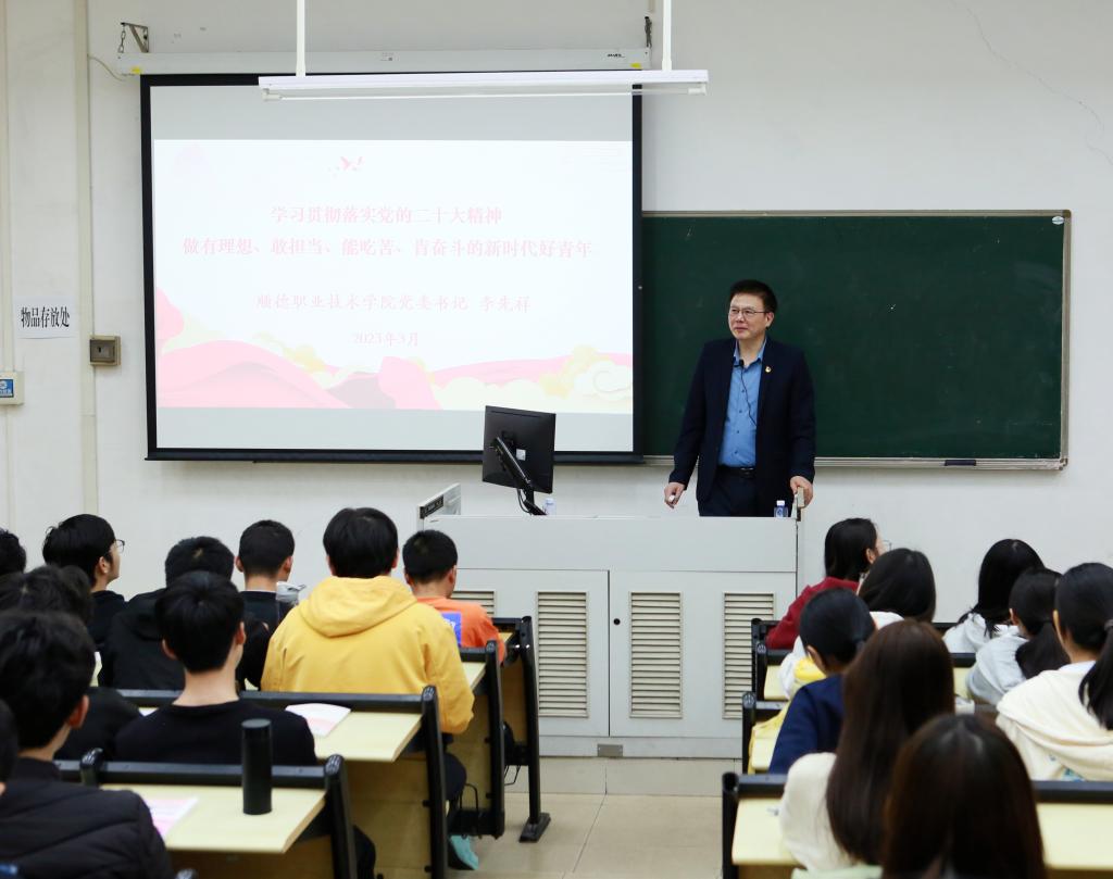 全国“最美大学生”梁荣浩、“中国大学生自强之星”陈伊烁、百名国家奖学金获奖学生优秀代表周凤华、全国五一劳动奖章获得者徐文华……李先祥将优秀顺职学子的奋斗事迹娓娓道来,鼓励同学们向身边的榜样学习。他强调,同学们要勇于担当,让青春在全面建设社会主义现代化国家的火热实践中绽放绚丽之花。要按照习近平总书记的要求,在坚定理想信念、厚植爱国主义情怀、加强品德修养、增长知识见识、培养奋斗精神、增强综合素质、树立健康第一理念、加强人文美学素养、弘扬劳动精神等九个方面下功夫,坚定不移听党话、跟党走,怀抱梦想又脚踏实地,敢想敢为又善作善成,立志做有理想、敢担当、能吃苦、肯奋斗的新时代好青年。