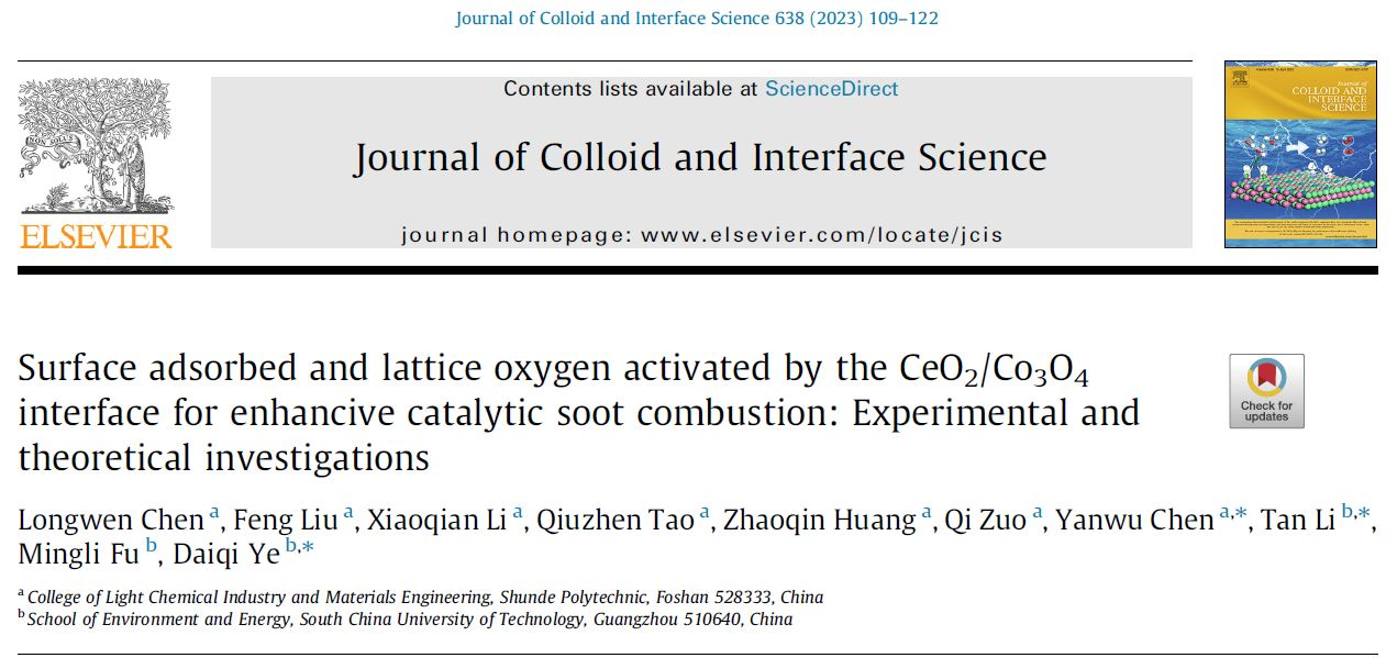 近日,轻化与材料学院科研团队的研究论文《Surface Adsorbed and Lattice Oxygen Activated by the CeO2/Co3O4Interface for Enhancive Catalytic Soot Combustion: Experimental and Theoretical Investigations”》被中科院一区期刊《Journal of Colloid and Interface Science》选为第640期的封面论文。德赢为论文第一单位兼通讯单位,轻化与材料学院院长陈燕舞教授为论文共同通讯作者,青年党员教师陈龙文博士为论文第一作者,李小倩、陶秋珍、黄昭芹等轻化与材料学院学生在SRP项目中参与了该项研究工作。