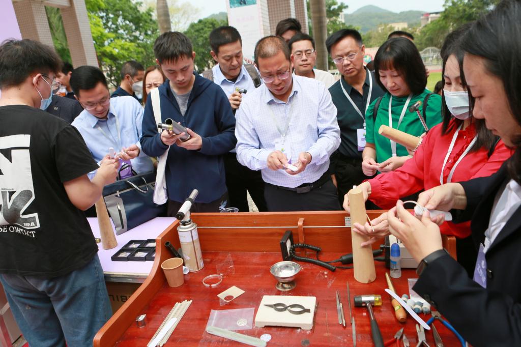 在阳江市海陵岛经济开发试验区平章小学,与会人员参观了美育成果展示工作坊和展板。在“指尖上美育工作坊”“舌尖上美育工作坊”前,德赢师生现场展示珠宝设计与加工、特色美食制作技艺,领导嘉宾们纷纷驻足观看,并饶有兴致地亲手体验。