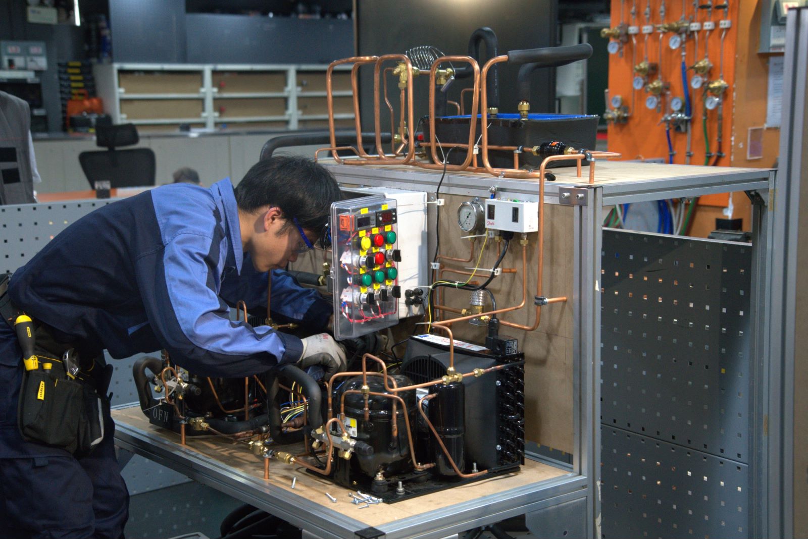 该赛项属于世界技能大赛项目,共有3个考核模块,选手需在12.5个小时内独立完成制冷组件、制冷系统、电控系统的加工、安装及系统测试、调试,以及对空调设备进行故障查排及修复等。