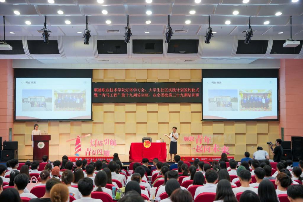 为深入学习贯彻党的二十大精神,落实立德树人根本任务,引导大学生厚植家国情怀、涵养进取品格,培养有理想、敢担当、能吃苦、肯奋斗的新时代好青年,5月29日下午,灯塔学习会、“青马工程”第十九期培训班、业余团校第三十九期培训班暨“大学生社区实践计划”结对共建签约仪式在德赢一号学术报告厅举行。佛山团市委副书记陈颖、顺德团区委副书记贾菁岚、学校副校长罗丹,校团委负责人、各二级学院团干及学生骨干300多人参加活动。