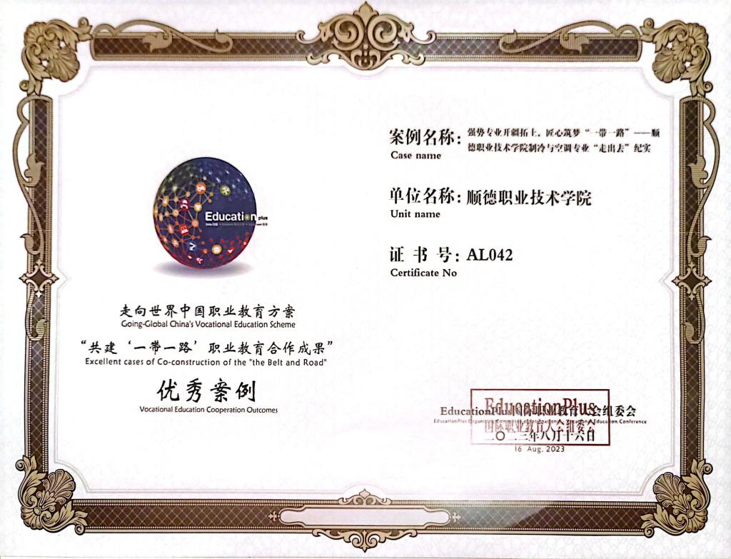 此外,学校能源与汽车工程学院国际化案例《“强势专业开疆拓土,匠心筑梦‘一带一路’——顺德职业技术学院制冷与空调专业‘走出去’纪实”》被评为“走向世界中国职业教育方案——共建‘一带一路’职业教育合作成果”典型案例。同时,在本次大会的分会场“‘一带一路’国家职业标准共建学术研讨会”上,德赢凭借轻化与材料学院国际职业标准共建项目,被授予“老挝国家职业标准共建项目示范建设单位”牌匾。基于德赢服务“一带一路”建设的一系列成果,德赢在本次大会上被评选为“2023年职业教育对外交流与合作典型院校”。