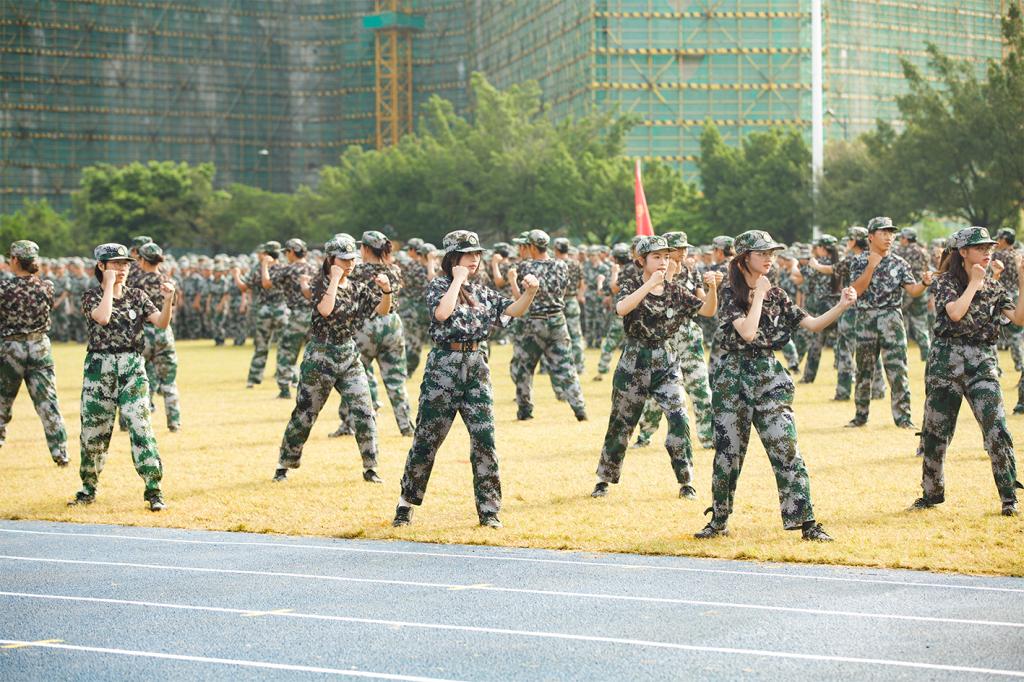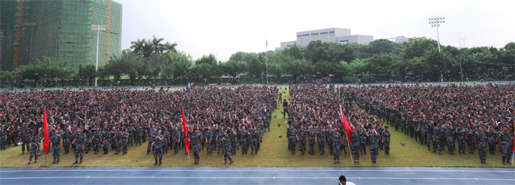 来自10个二级学院的7000余名新生以分列式队形依次通过主席台前接受检阅。同学们步伐整齐、口号嘹亮,展现出顽强拼搏、意气风发的青春风采。随后,新生进行了棍术、拳术汇报表演,教官进行了格斗散打展示,现场不时响起热烈的掌声。