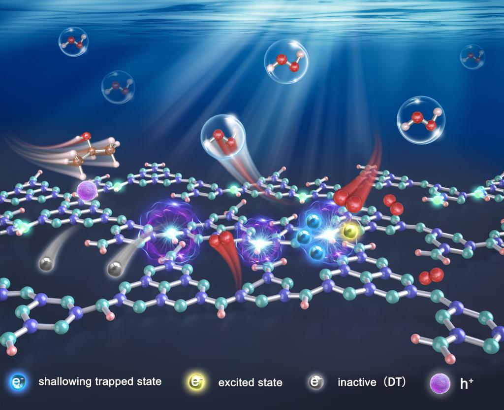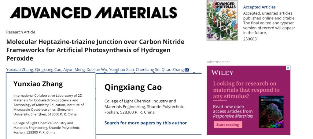 近日,轻化与材料学院科研团队青年教师张云霄博士、曹庆翔博士(共同第一作者)在国际顶级期刊《Advanced Materials》(2023年影响因子29.4,中科院一区,材料顶级期刊)发表题为《Molecular Heptazine-Triazine Junction over Carbon Nitride Frameworks for Artificial Photosynthesis of Hydrogen Peroxide》的研究论文。
