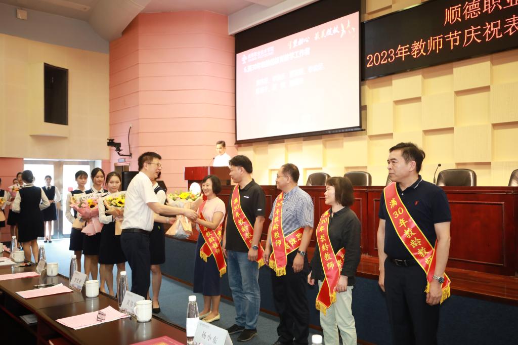 9月6日,在德赢2023年教师节庆祝表彰大会暨新学期工作会议上,校领导为优秀教师代表、优秀教育工作者代表、“金牌教师”,获得佛山市、顺德区表彰的教师,取得突出业绩的教师个人或团队,以及满30年教龄教师颁奖、献花,树立师德师风榜样和楷模,在全校范围内掀起学习先进、争当先进的热潮。会上,学校党委委员、纪委书记黄伟坚作师德建设主题教育月动员部署,强调各单位要结合实际制定方案,通过多种形式引导教师全面贯彻党的教育方针,牢记为党育人、为国育才的初心使命,提高自身师德修养水平,自觉投身到立德树人、教书育人和学校改革发展攻坚任务中,为学校高质量发展作出更大贡献。