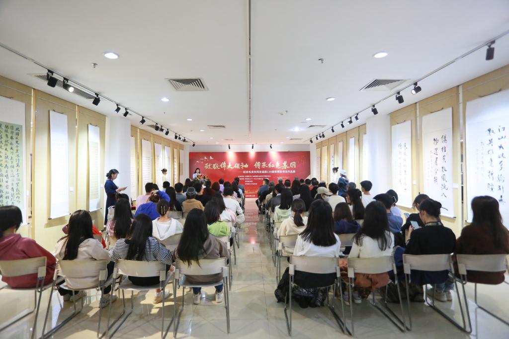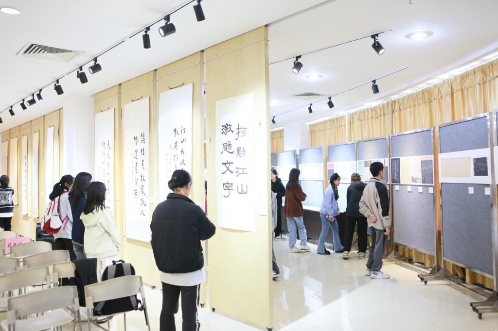 展览吸引了许多师生驻足流连,引发热烈反响。观展的龙思蓉同学表示,“这次非常难得,作品的展出过程也是学习的过程,同学和老师会点评作品好的地方和不足之处,自己能从中受益。不但如此,我也通过观看其他师生的作品,进一步汲取知识。我们将努力通过书法的表现形式,向伟大领袖学习和致敬,也肩负起传承和弘扬红色基因的重任。”