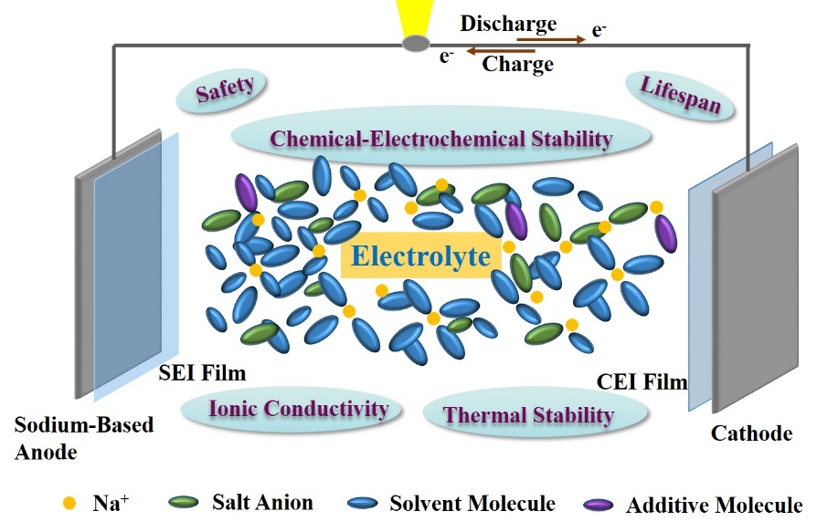 随着锂资源的消耗和预期的稀缺性,人们越来越渴望探索替代可持续产品或技术,以满足不断增长的全球能源存储需求。近年来,室温钠基电池作为一个重要的研究课题重新浮出水面,被认为是能够取代锂电池进行大规模储能的潜在下一代二次电池系统。除了众所周知的资源丰富和广泛分布的优势外,钠电池还可以使用铝箔代替铜箔作为正极集流体,进一步降低电池的生产成本。评价钠基电池性能的关键指标包括安全性、能量密度、循环寿命、功率密度和生产成本等,而这些指标都受到电解液性质的影响。本论文综述了近年来用于钠基电池有机液态电解液体系的研究进展,包括溶剂和钠盐改性,功能添加剂等方法来改善钠基电池的性能。