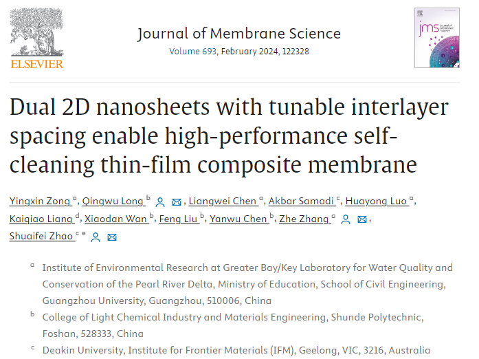 近日,德赢轻化与材料学院科研团队联合广州大学和迪肯大学,在国际高分子材料领域顶级期刊《Journal of Membrane Science》上发表了最新研究成果。该成果的题目为《Dual 2D nanosheets with tunable interlayer spacing enable high-performance self-cleaning thin-film composite membrane》。这篇论文的影响因子达到了9.5,并被中科院评定为一区期刊。德赢轻化与材料学院科研团队的龙庆武博士(第一通讯作者)、刘锋博士、陈燕舞教授等共同参与了这项研究工作。德赢是该论文的第一合作单位,为研究成果的取得做出了重要贡献。此外,这项研究得到了国家自然科学基金、广东省区域联合基金以及广东省教育厅特色创新等项目的支持。