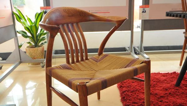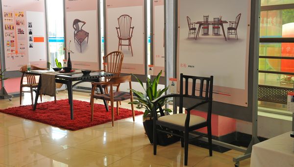 在家具展区,家具设计专业毕业生黄群森正介绍自己设计的作品“飞鱼椅”。他的作品带有明显的中国风,并把北欧的设计和亚洲家具文化融合在一起,椅子线条劲挺圆润,目前已经有厂家在生产。黄群森同学正跟参观的领导和企业代表们说“目前已有5~6家企业有意向和我签约,我也希望能做出更好的设计作品。”