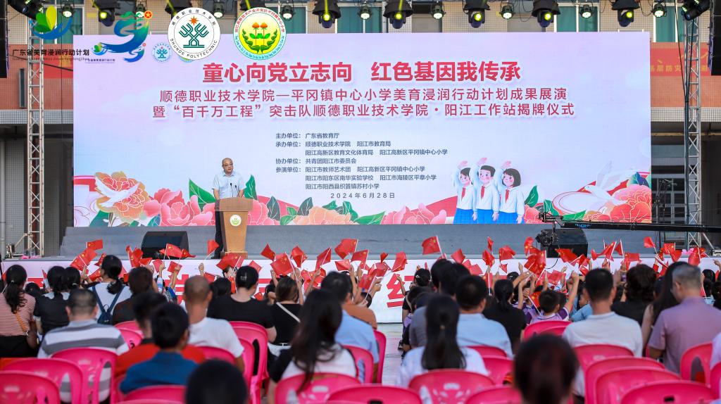 6月28日,顺德职业技术学院-平冈镇中心小学美育浸润行动计划成果展演暨“百千万工程”突击队顺德职业技术学院·阳江工作站揭牌仪式在阳江举行。