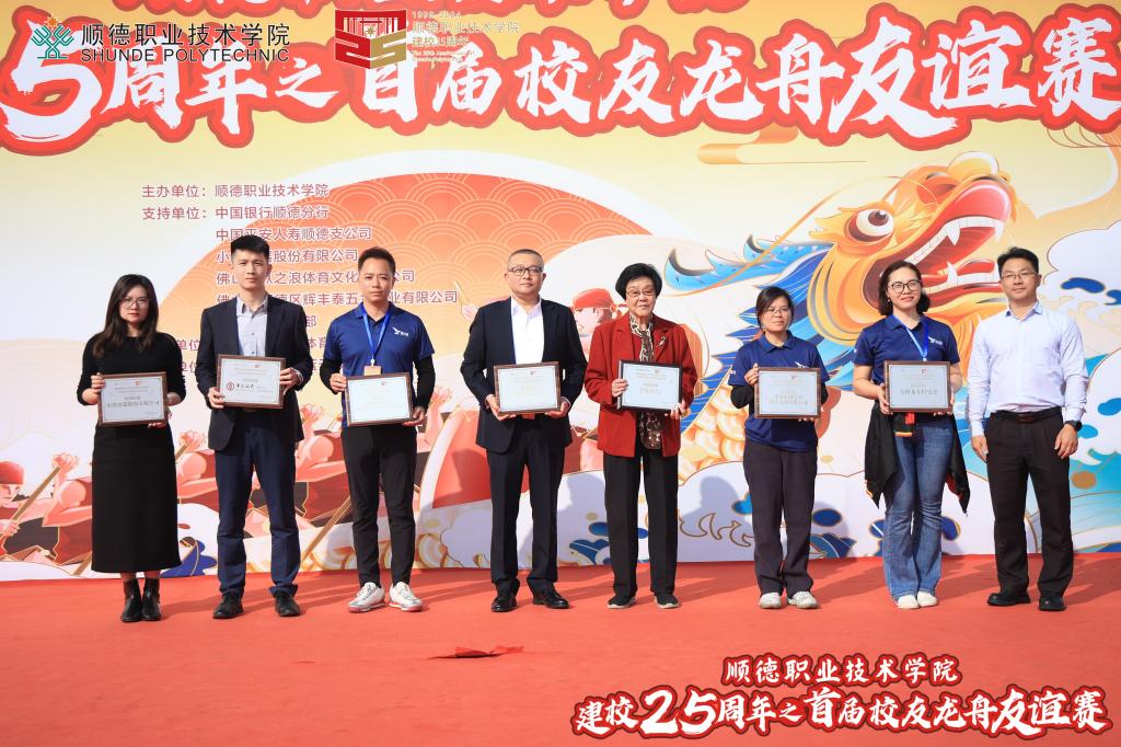 经过激烈角逐,最终,商学院校友龙舟队、丹田物业龙舟队、顺德职业技术学院龙舟1队分别夺得校友组、教职工组、特邀组冠军。在热烈的掌声中,领导嘉宾为获奖队伍颁奖。