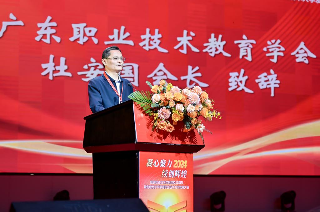 杜安国致辞指出,顺职院建校以来,不断深化教育教学改革,优化专业设置,推进产教融合,毕业生就业质量高,科研与社会服务能力突出,赢得了社会的广泛认可和高度评价,已发展成为广东乃至全国职业教育领域的佼佼者,为广东职业教育发展提供了宝贵经验和示范。面对创建职业本科院校的机遇,要聚合更优质的资源,服务粤港澳大湾区建设;提供更高质量的服务,助力区域经济社会发展;培养高层次技术技能人才,服务广东人才强省战略。期待顺职院在25年发展的基石上,继续秉承顺德人“敢为人先、勇于创新”的精神,以更加开放的姿态和更加坚定的步伐,引领职业教育改革发展潮流,为广东推动中国式现代化高质量发展贡献更多顺职智慧、顺职力量。