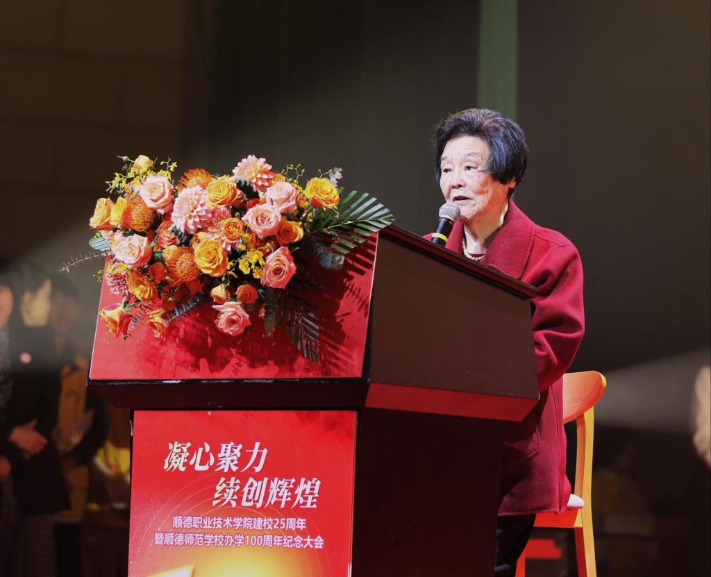 佘炜在讲话中深情回顾了自己1949年从顺德师范毕业至今,怀揣对教育的热爱,毅然投身教育事业的人生经历和感悟。她表示,100年前,顺德师范学校在时代的呼唤中诞生。当年,老师们凭着一腔热忱,怀揣报国之心,在简陋的教室里传道授业解惑。“75年教育生涯,让我深刻体会到乐在其中、乐见其成的喜悦。广大师范校友无论身处何方,都忘不了母校的培育之恩,将继续传承弘扬师范精神,始终致力于回报社会。”佘炜表示,2002年顺德师范并入顺职院后,教育血脉得以延续、优良传统得以发扬,希望学校紧抓机遇、奋发向上,凝心聚力、续创辉煌。