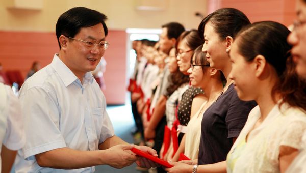 颁奖仪式中,夏伟校长为伍伟杰等14名优秀教师、郭永生等24名优秀教育工作者颁奖。