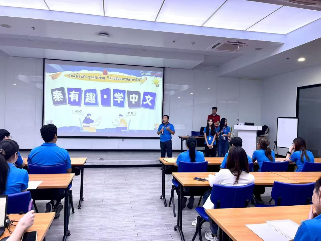 在中文教学环节,美的集团以“泰有趣,学中文”为活动环节,积极发动泰国员工开展中文语言与中华文化教育。为使课堂能够更有趣、更实用,郭峰以“线下+线上”双轨教学的模式,在美的工厂开展“职业技能+语言文化”融合教学。课程设计紧密结合泰国员工实际需求,融入车间场景、安全标识等实用内容,并运用拼音歌曲等生动化教学媒介辅助教学。泰国学员学习热情高涨,线上课堂互动踊跃,展现出跨文化交流的蓬勃生命力。