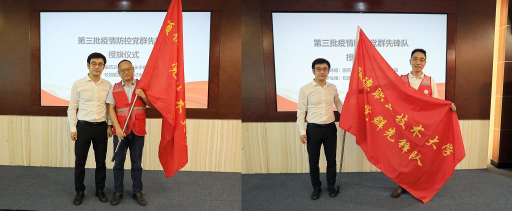 现场,卢清华分别为教师组、学生组党群先锋队授旗,罗丹、练凌东为各组发放防疫工具包和慰问品。