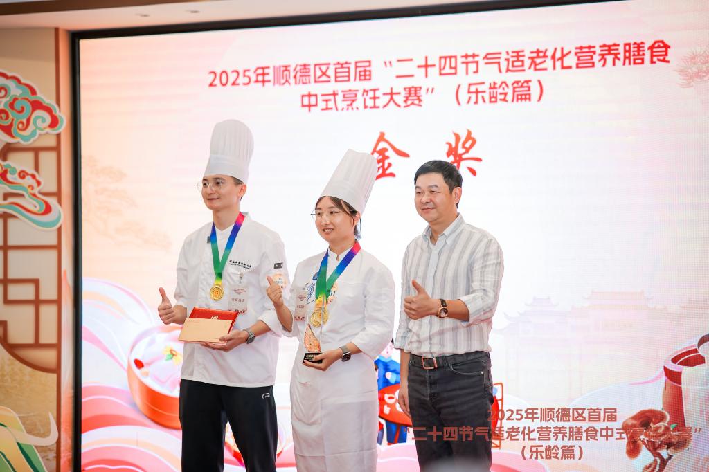 9月8日,2025年顺德区首届“二十四节气适老化营养膳食中式烹饪大赛(乐龄篇)”在德赢烹饪学院举行。经过激烈角逐,德赢烹饪学院教师张雪妍、谭聪凭借融合节气养生与顺德风味的创新菜品,一举斩获赛事“金奖”及“最具人气团队奖”荣誉称号,彰显了德赢烹饪学院在适老化膳食研发领域的领先实力。