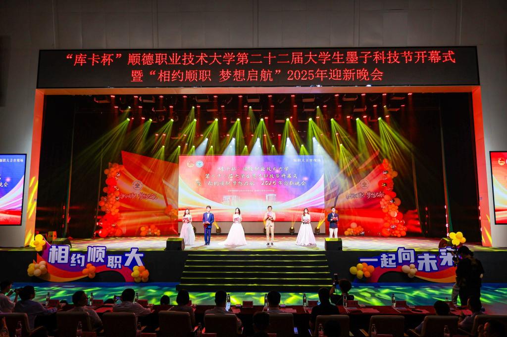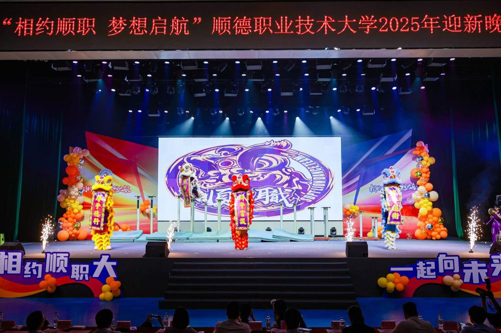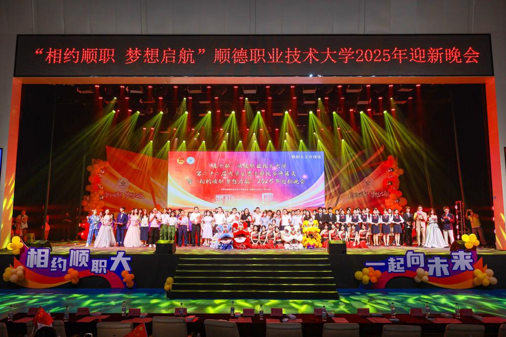 科技节开幕式后,迎新晚会精彩接档。晚会以“梦想启航”“多彩顺职”“强国有我”为三大篇章,通过醒狮、街舞、民乐、朗诵等多元艺术形式,展现顺职学子的青春风采与精神风貌。