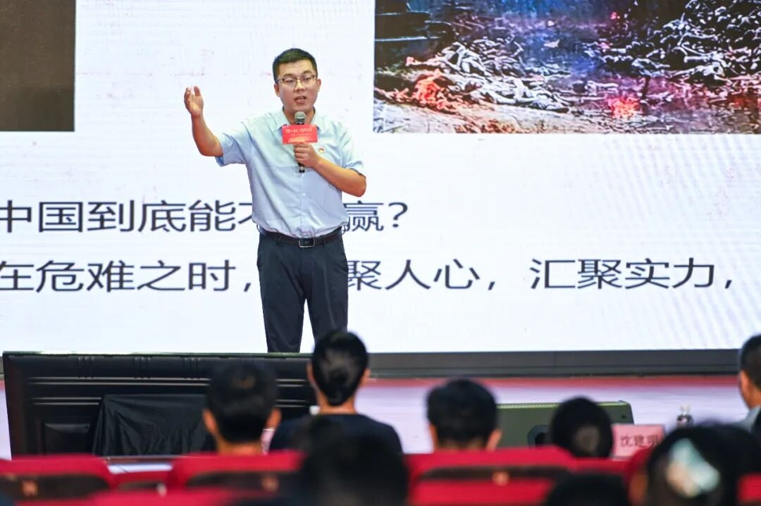 从伟大胜利到伟大复兴,必须弘扬伟大抗战精神;从伟大胜利到伟大复兴,必须坚持实干奋斗。时代的号角已经吹响,历史的接力棒已传递到青年手中。作为青年一代,我们当以何种姿态奋斗?当以何种作为担当?宣讲员、德赢教师安济森用一堂87年前的青春动员令给出了答案。随着安济森的宣讲,时光回到了1938年5月的顺德碧江。在迷茫中,广雅中学师生迎来叶剑英将军一场豪情万丈、催人奋进的演讲,这深深触动了在场800多名师生及碧江群众的心灵。自此,广雅中学学生会和抗日救亡宣传队纷纷组织学生学习军事,当地群众纷纷加入抗日游击斗争,在不同的战线上开展轰轰烈烈的抗战运动,产生了较大影响。