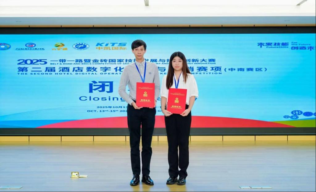 10月13日至15日,2025一带一路暨金砖国家技能发展与技术创新大赛第二届酒店数字化运营与营销赛项(中南赛区)在广西南宁举办。德赢酒店与旅游管理学院教师张健伦、饶云在教师组比赛中获二等奖,成功晋级国赛。