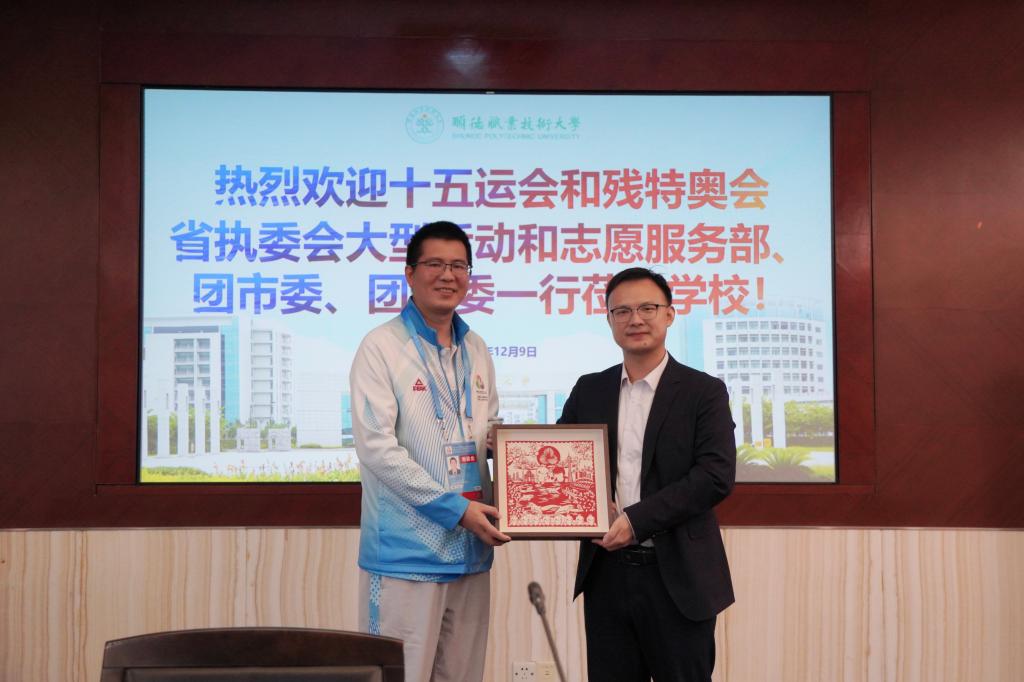 朱瑞峰对德赢赛会志愿服务的组织工作和志愿者的优异表现给予高度肯定。他指出,大型赛会志愿服务是重要的实践育人平台,赛会志愿者在保障赛会顺利举办的同时,更要努力实现“助人”与“自助”的双重收获。要强化赛会志愿服务中的思想政治引领,将党建、团建与志愿服务深度融合,发挥好赛会志愿服务育人功能;同时要加强宣传工作,讲好残特奥会顺职大志愿者故事。结束之际,李天赠代表学校向调研组赠送魅力湾区红色顺德非遗剪纸。