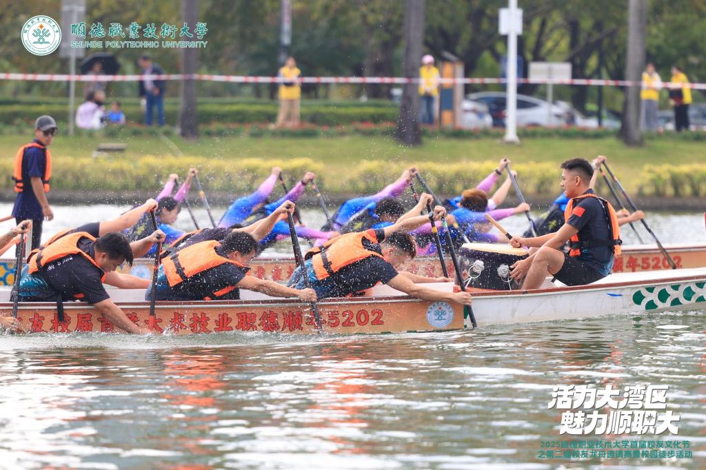 随着发令枪响,龙舟如离弦之箭破水而出,在湖面上划开道道白浪。选手们配合默契、勇往直前,起桨、划水、收桨一气呵成,生动诠释龙舟精神、体育精神。岸边观赛区人头攒动,欢呼声、加油声此起彼伏。师生校友们为支持的队伍摇旗呐喊,近距离感受龙舟运动的激情与活力。