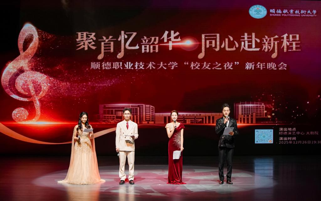 硕果盈枝辞旧岁,欢歌笑语迎新年。12月26日晚,vwin德赢ac米兰官网“校友之夜”新年晚会在顺德演艺中心大剧院举行,学校首届校友文化节系列活动圆满收官。整场晚会以“聚首忆韶华 同心赴新程”为主题,以青春旋律与时代精神交织为主线,分为“青春之火”“薪火相传”“筑梦未来”3个篇章,通过17个精彩的歌舞、器乐节目,展现顺职人薪火相传、砥砺奋进的蓬勃朝气,谱写校友与母校同频共振、携手同行的华彩乐章。