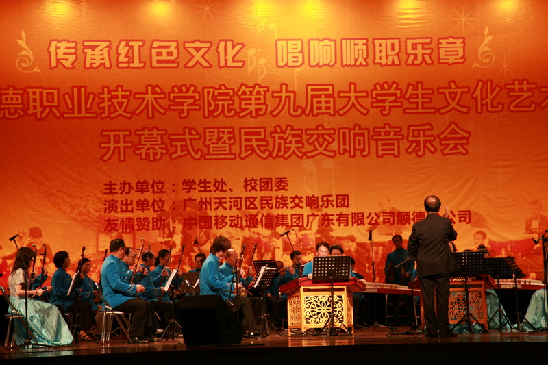 开幕式结束后,来自广州天河区广东乐团的艺术家们为德赢师生呈现了一台充满中国传统民族特色的精品音乐会。一曲热烈的《得胜令》开始了观众的音乐之旅,著名广东音乐家陈涛老师充满激情的指挥、乐团极富感染力的演奏,震撼了现场的每一位听众。之后,轻快活泼的笛独奏《旱天雷》、高亢激扬的二胡演奏《新赛马》、粗犷奔放的民族管弦乐合奏《赛龙夺锦》都使观众赞叹不已,现场气氛高涨,掌声四座。一曲熟悉的《花好月圆》把晚会拉入尾声,而音乐会也在经久不断的掌声中圆满结束。