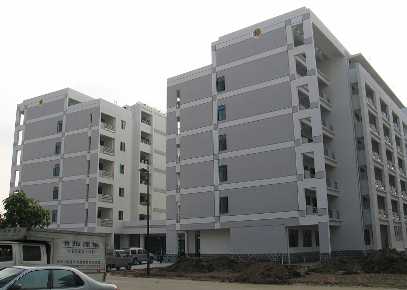 新建成的学生宿舍共有两座宿舍楼,占地面积约14043平方米,楼高7层,建筑面积12866平方米。共建有111个单元,271个房间,每单元配有小客厅、房、洗漱间和卫生间,可供1016名学生入住。宿舍宽敞明亮,各类附属用房及设施配置有:学生活动室、辅导员宿舍、各楼层开水供应点、洗衣房、中庭绿化休憩区、太阳能热泵热水系统、弱电网络系统等。室内客厅、房统一配置家具、行李架、预留空调安装位置等。