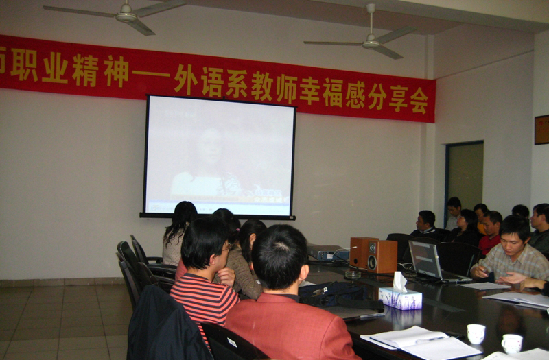 为了深入学习实践科学发展观,在学院纪委谭谦章书记的指导下,结合上学期开展的“大爱见证师魂,奉献再育师德”活动,11月12日下午,我系组织了全体教师观看“抗震救灾英模实际报告会”的录像,学院纪委谭谦章书记、外语系全体教师出席参加,活动由宁顺青主任主持。