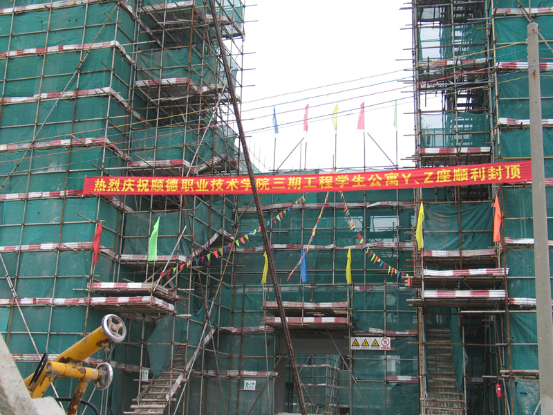 顺德职业技术学院9号、10号学生公寓主体工程经过近四个月的紧张施工,于11月3日顺利封顶。