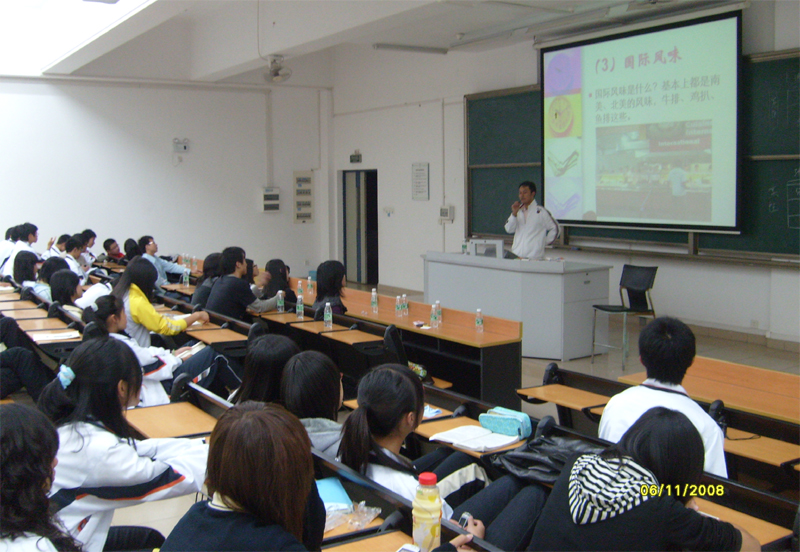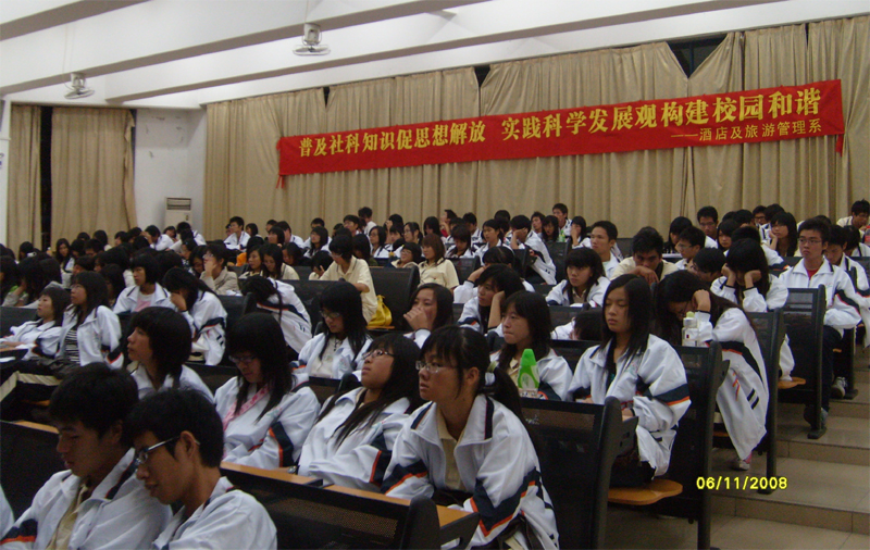 为深入贯彻落实科学发展观,大力宣传普及社会科学知识,努力提高师生的思想道德素质和科学文化素养,丰富师生的科学文化生活,促进全面和谐发展,酒店及旅游管理系按照举办社科普及周活动的相关要求,于2008年11月9日晚举办了“北京奥运演绎绿色经典”专题讲座。 本次讲座由顺德职业技术学院奥运餐饮服务队队长、酒店及旅游管理系高蓝洋老师主讲。高老师以“奥运知多少”的提问形式切入主题,与同学们共同探讨“绿色、科技、人文”的奥运理念,达到了开启学生智慧、普及社科知识的效果。