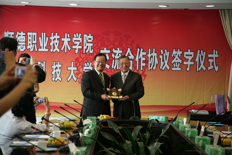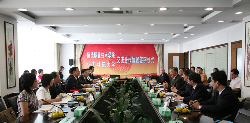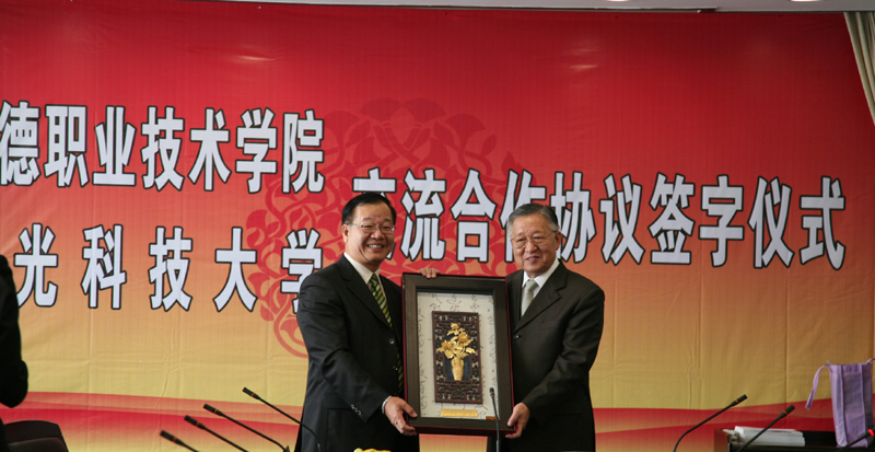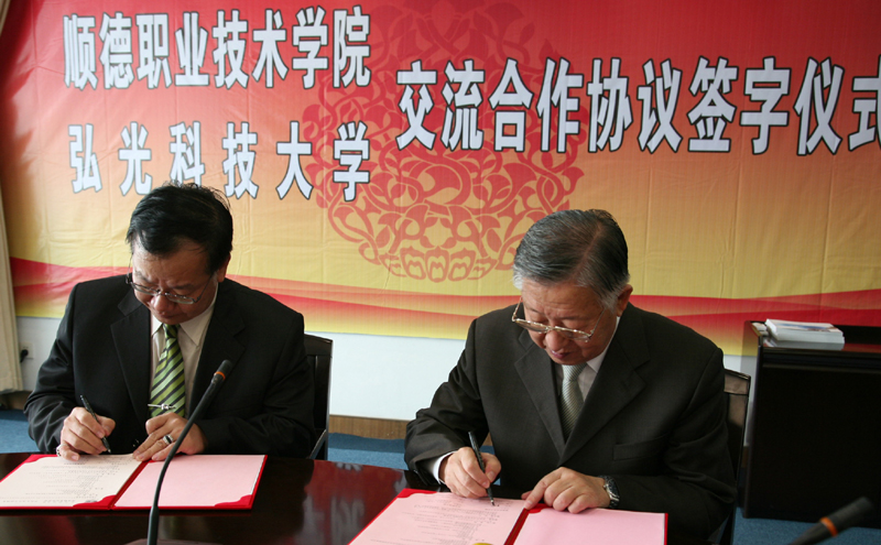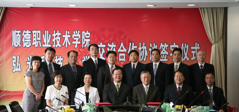 座谈会上,宾主双方就教师和学生交流、合作办学及开展科研合作达成了意向。陈智院长、陈昭雄副校长分别代表顺德职业技术学院和弘光科技大学签订了交流合作协议。