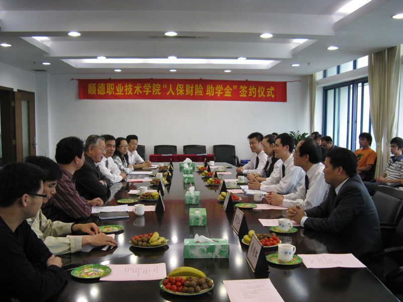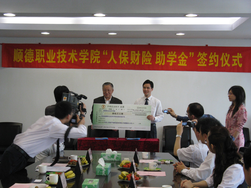 4月25日,我院与中国人民财产保险股份有限公司顺德支公司隆重举行了“人保财险助学金”签约仪式。从2008年9月起,我院20名家庭经济困难的大学新生将接受中国人民财产保险股份有限公司顺德支公司每学年4万元的资助。