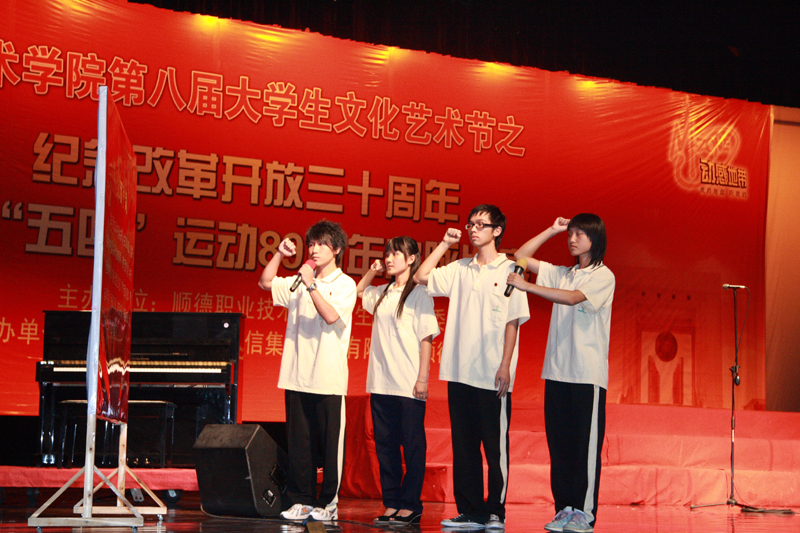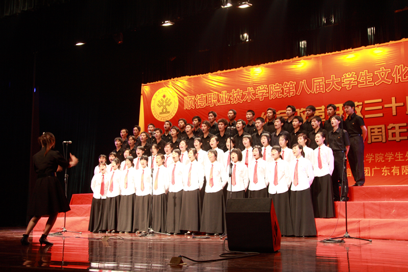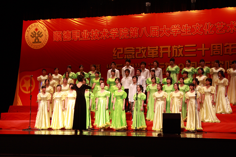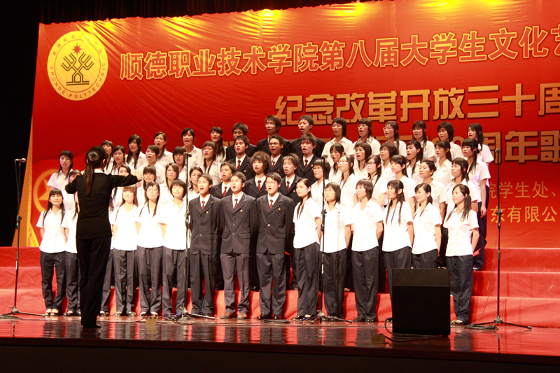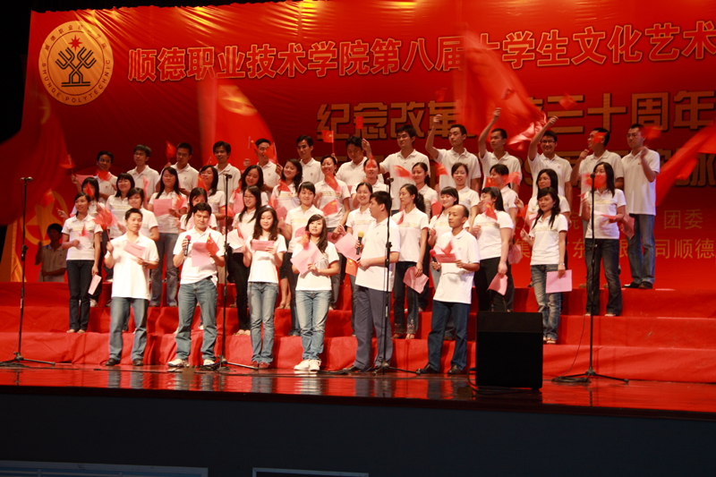 2008年5月11日晚,顺德职业技术学院的广大团员青年们相聚于梁銶琚礼堂,参加了由学生处、院团委主办的以“改革开放30周年,情系祖国赤子心;传承五四薪火,构建和谐顺职”为主题的歌咏比赛活动。经过激烈角逐,人文教育系代表队获得一等奖,经济管理学院、外语系代表队获得二等奖,:医学系、计算机技术系、机电工程系获得三等奖,外语系、艺术系、机电工程系获得最佳组织奖。