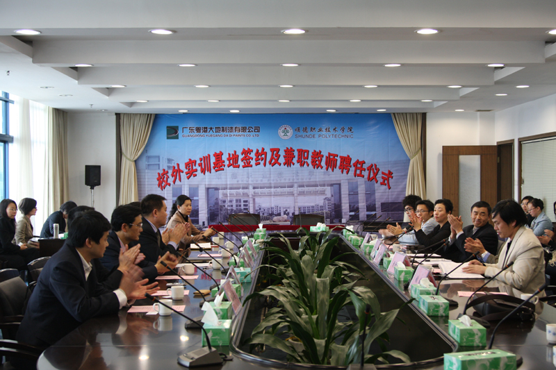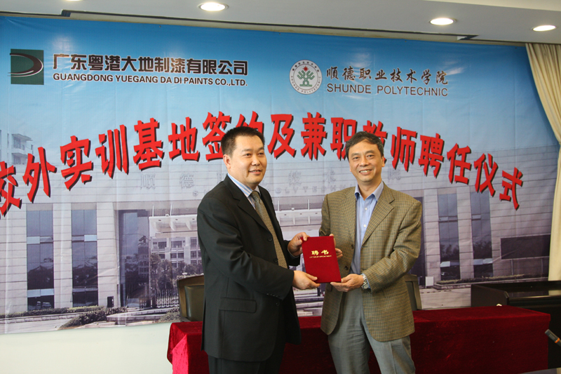 3月6日,经管学院与粤港大地制漆有限公司校外实训基地签约及兼职教师聘任仪式举行。仪式由经管学院副院长谢金生主持。顺德职业技术学院副院长罗勇武、组织人事处副处长朱杰以及经管学院的全体教师和部分学生代表参加了签约仪式。