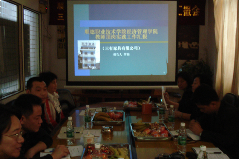 3月14日上午,“顺德职业技术学院经济管理学院、三有家具有限公司教师下企业顶岗实践工作评估报告会”在顺德龙江三有家具有限公司召开,经管学院财务管理专业教师罗姣就半年来在该公司实践锻炼的情况作了讲解汇报。学院组织人事处处长刘毓、副处长朱杰、经管学院院长高新和、经管学院实训中心主任程萍、三有家具有限公司总经理谭明、副总经理李满庆、财务经理刘纨纨及行政品管部、生产部、物控部部门经理等出席了报告会。财务会计专业群主任贺世强主持了会议。
