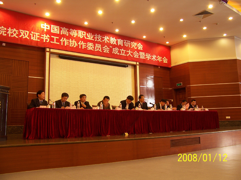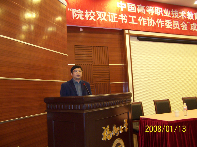 2008年1月12日,中国高等职业技术教育研究会“院校双证书工作委员会”成立大会暨首届学术年会在福州召开。来自全国104所高职院校150多位代表参加了这次会议。会上,我院副院长陈粟宋做了题为《高职院校实施“双证书”制度的探索与实践》的报告并被选为“院校双证书工作委员会”副主任委员。