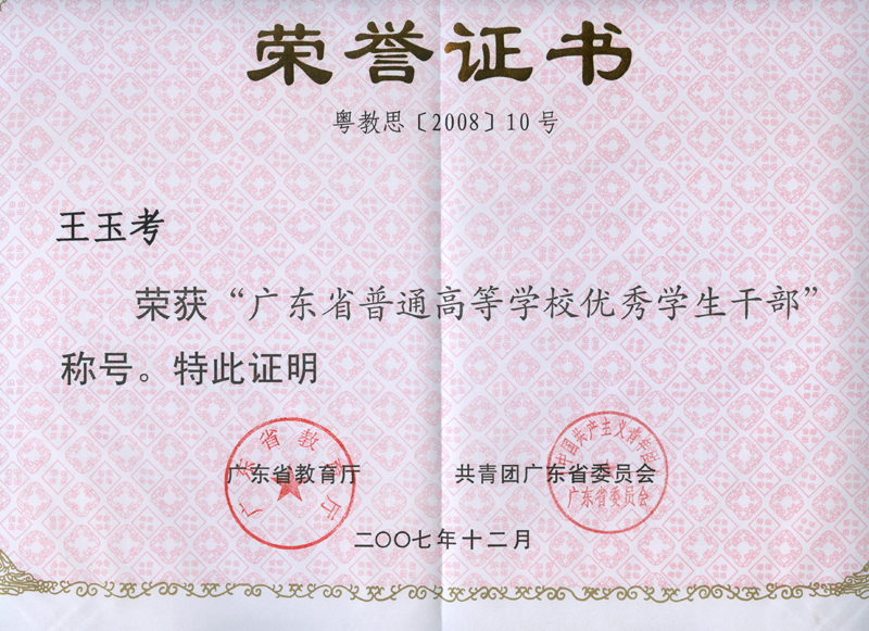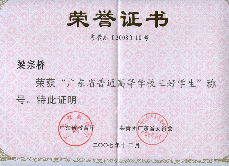胡宝莹、梁宗桥同学被评为广东省“三好学生”