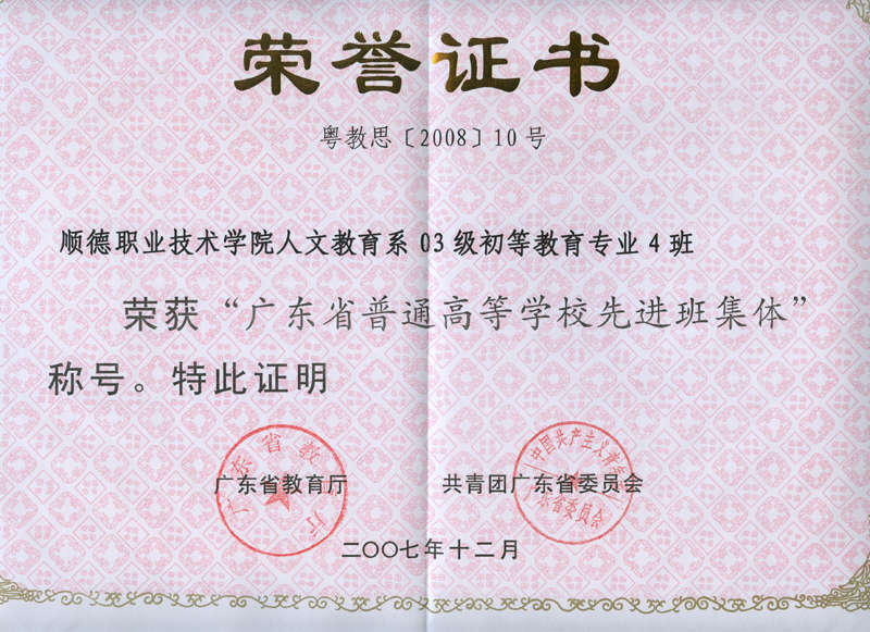 近日,省教育厅、团省委对省“三好学生”、“优秀学生干部”和“先进班集体”及其标兵进行了表彰。我院酒店及旅游管理系胡宝莹同学、计算机技术系梁宗桥同学被评为广东省“三好学生”,机电工程系王玉考同学被评为广东省“优秀学生干部”,人文教育系03级初等教育专业4班被评为广东省“先进班集体”。
