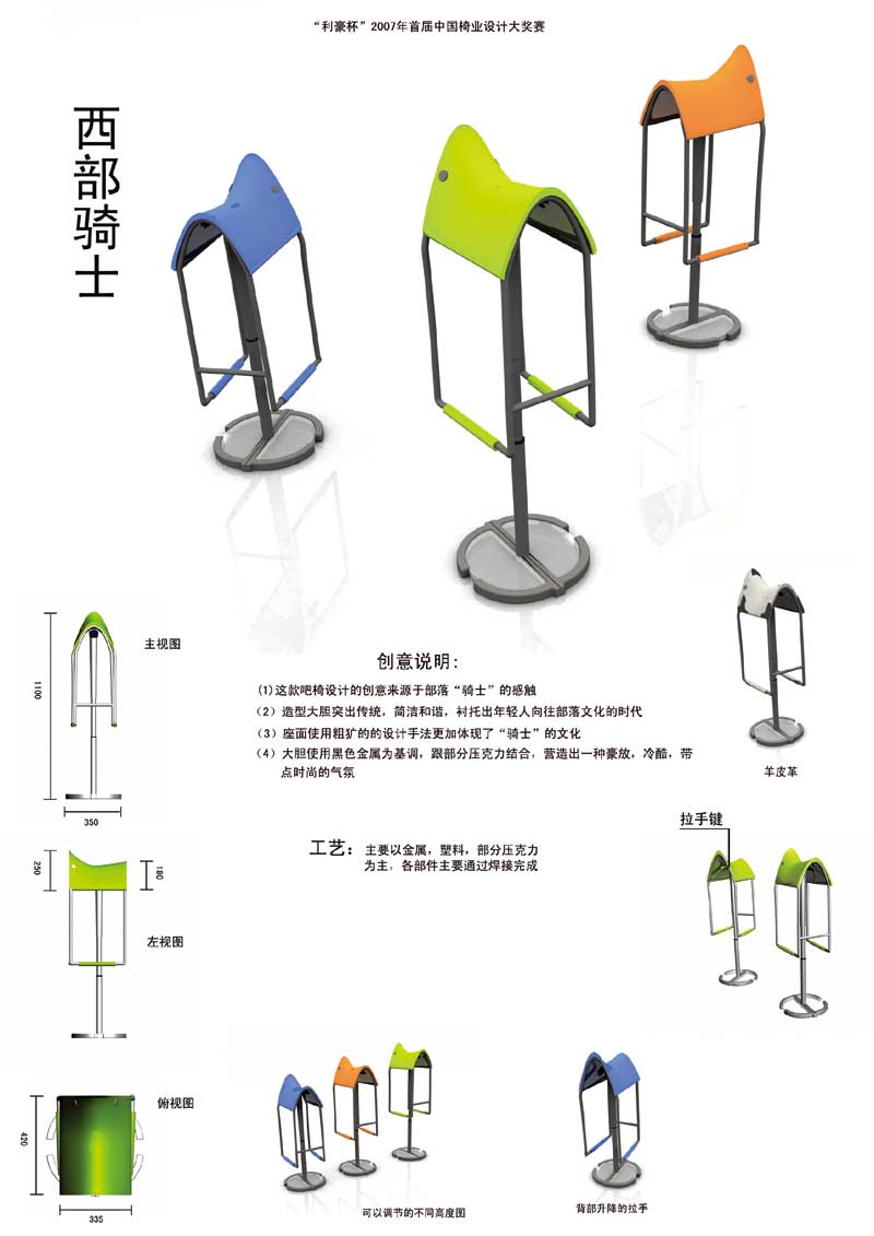 近日,由中国家具协会主办、浙江省安吉县人民政府承办的首届“利豪杯”2007首届中国椅业产品设计大奖赛在安吉行政中心举行颁奖仪式及展览会,由我院艺术设计系彭亮、孙亮、刘晓红、潘速圆老师指导,杨伟杰同学的设计作品《西部骑士》获得金奖(奖金10000元),梁妃二同学的设计作品《诗意.喻意》获得金奖(奖金10000元),魏少凡同学的设计作品《向日葵排椅》获得金奖(奖金10000元),郭业国、杨伟杰、杨翠琼、徐赵明同学分别获得铜奖(各3000元奖金)。